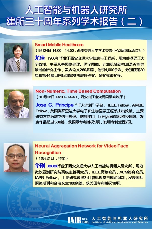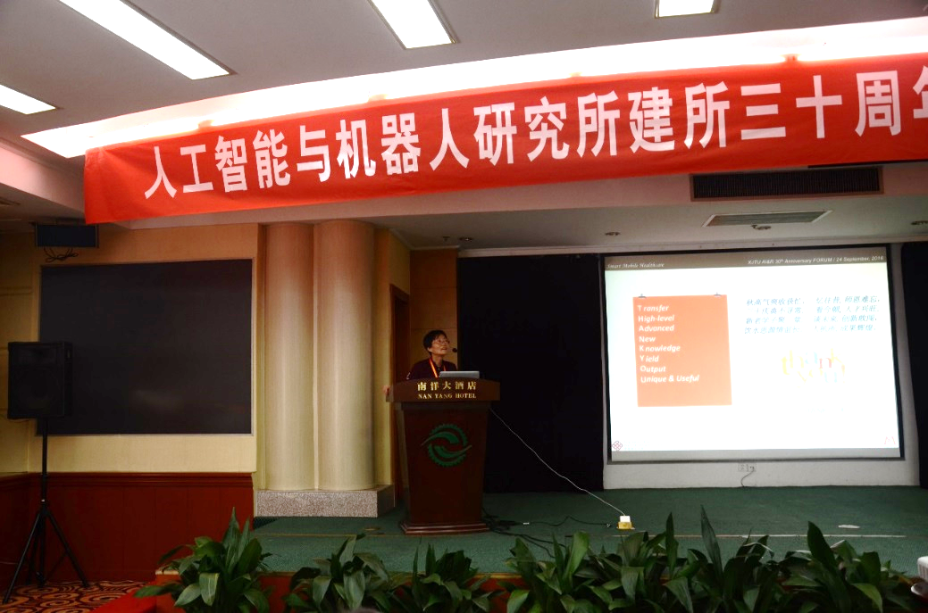 9月24日上午,“人工智能与机器人研究所建所三十周年系列学术报告会暨创新与创业论坛”在西安交通大学学术交流中心正式拉开帷幕。开幕式上,现任所长郑南宁教授回顾了研究所过去三十年的发展,同时展望未来,希望大家继续发扬坚持、包容、协作的人机所追求卓越精神,并代表人机所第一任所长宣国荣教授祝福建所三十周年、问候全体师生。毕业生代表西龙同辉有限公司王龙总裁感慨自己是人机所第一批毕业的学生,成为了大家的大师兄。三十年来,人机所培养了许多优秀学生,他有幸成为其中一员;并且特别祝贺人机所在郑老师的带领下,在师弟师妹们的努力下,在视觉领域取得了很多很好的成果!教师代表薛建儒教授回忆了自己1996年考入人机所,之后留所任教,在所学习工作二十年的历程。这些年,人机所优良的学风及团队精神对他有着深远的影响;下一个十年,在所里师生的共同努力下,人机所定将继续步入大发展的阶段。博士生代表董航同学表示要用实际行动践行人机所严谨、踏实、积极、上进的精神和团队协作的作风;硕士生代表余思雨同学表示人机所的人文关怀带给了她归属感,期望自己能团结同学,继续传承人机所“优秀是一种习惯”的传统。