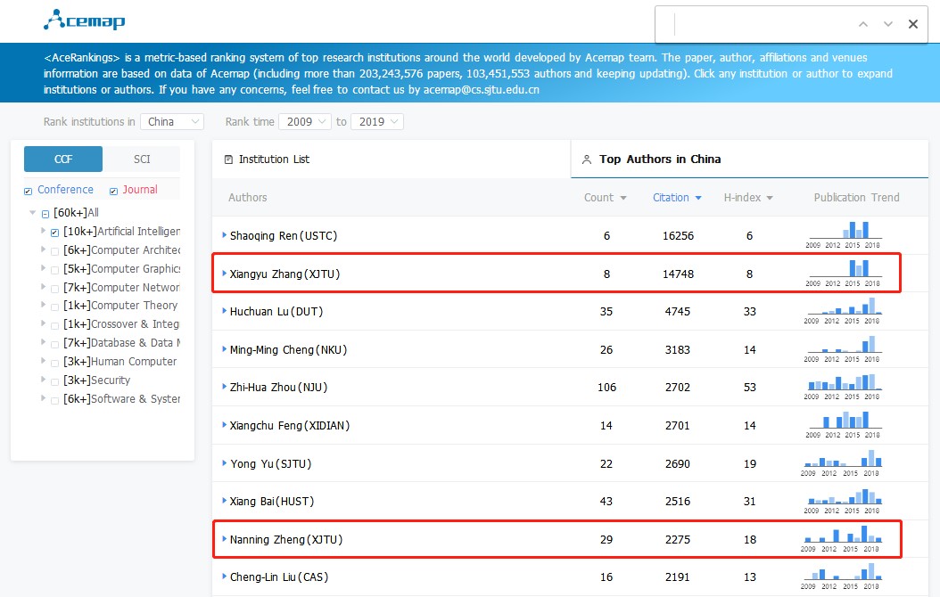 同时,威廉希尔中国官网3名师生进入人工智能领域国内学者前20名,包括张祥雨(已毕业,就职旷视科技)、郑南宁教授和袁泽剑副教授,彰显了我校在人工智能领域的研究实力。值得一提的是,在美国学者Top50榜单中,威廉希尔中国官网院长、兼职教授孙剑博士高居榜单第2名,体现了学院在人工智能领域的国际影响力。