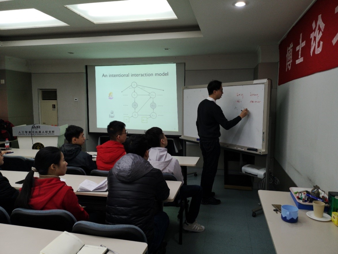 访问期间,兰旭光教授陪同David 教授参观了人机所,并针对机器人和人机交互等问题进行了深入讨论和交流,提出了一些值得深入探讨的研究点。David教授与兰旭光教授课题组的学生进行了面对面的交流会。陈星宇、张翰博、万里鹏、许杰、孙世光、杨辰杰、赵冰蕾等研究生各自介绍现阶段的科研工作以及遇到的问题。在听取完汇报后,David教授认真对每个人进行了指导,对学生们所遇到的问题都给予了详细的解答并且为学生们将来的研究工作提出很多建设性意见。同时,David教授结合自己的研究,向学生们介绍了自己的科研经验,以及科研中要注意的事项。他强调在科研的过程中,要开阔视野,敢于质疑,敢于想象。要将自己的工作聚焦到一个具体的问题,多和其他学者讨论交流。另外,David教授还根据自己的论文写作经验,教给大家写作高水平学术论文的方法,以及在写作过程中的注意事项。