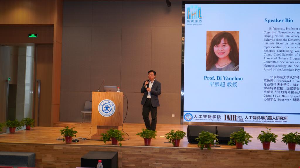 伴随着现场热烈的掌声,“人工智能与科技革命”系列主题讲座正式开讲。毕彦超教授首先作了一场题为“人类大脑知识表征(Knowledge Representation in the Human Brain)”的报告,以一段有关“感官直接感受的知识”的科幻短片为开头,围绕着人脑知识表征系统这一核心,毕彦超教授介绍实验室的一些工作,这些工作使用认知、神经成像和神经心理学方法,对于健康的测试者、感觉缺失的个体(失明和聋哑)或脑损伤的个体进行研究。研究结果指出,一个高度分布式的系统包含两种不同类型的信息编码:一种基于分布式感官体验,以及另一种基于语言。报告深入浅出,分享给同学们有关认知科学前沿领域的研究内容。