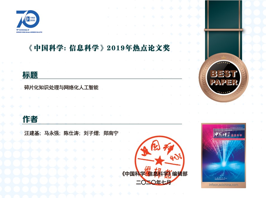 近日,人机所发表论文《碎片化知识处理与网络化人工智能》(作者:汪建基#、马永强#、陈仕韬、刘子熠、郑南宁*,通讯作者:郑南宁)被《中国科学:信息科学》评为2019年热点论文奖。
