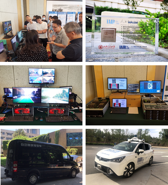 现场演示阶段,课题组向专家们展示了由西安交通大学人工智能与机器人研究所自主研制的面向自主智能体的神经网络推理芯片HiPU200,同时演示了无人驾驶汽车搭载该芯片完成障碍物检测识别、车道线检测及红绿灯检测识别等感知任务的运行情况。HiPU200芯片采用基于片上互连网络的多核处理器架构,28nm工艺进行流片,工作频率1GHz,实测峰值算力13Tops @INT8。运行相同神经网络的情况下,HiPU200的处理速度是英伟达RTX2080Ti GPGPU的7.7-35倍,能效比是其的15-30倍。算力优于国际知名公司Mobileye的 EyeQ4芯片,优于地平线征程5处理器。HiPU200的性能得到第三方测试机构和技术专家的高度评价。