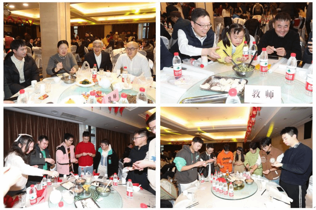 长乐厅内热闹非凡,欢声笑语喜气洋洋。晚会前,全体师生一齐包饺子,感受年节氛围。与此同时,大屏幕上播放着晚会花絮和采访视频,让大家对接下来的晚会充满了期待。