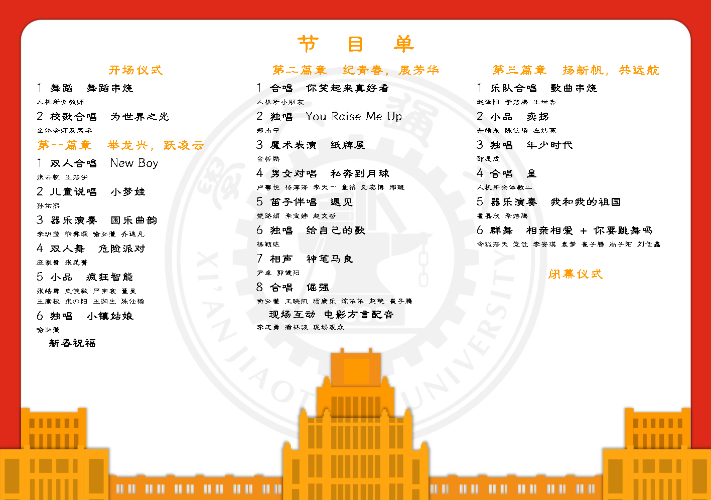 本次联欢晚会分为三个篇章,第一篇章“举龙兴,越凌云”,象征着对龙年的美好期待;第二篇章“纪青春、展芳华”展现了师生们的青春风采;第三篇章“扬新帆,共远航”彰显了全体师生新的一年再攀高峰、共创辉煌的坚定决心。