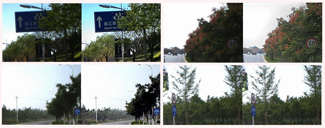 无人驾驶智能车在行驶过程中,因运动以及其他因素可导致车载相机图像的质量劣化,不利于道路和行人的识别,因此实时图像增强算法的研究有着极大的意义。交通场景图像增强数据库提供了劣化的车载相机图像序列及其增强后的对比图像序列。车载相机图像序列数据采自车辆在实际行驶过程中因运动以及其他因素而导致的质量劣化图像序列,增强后的图像为运用图像增强方法与技术对车载相机图像序列数据进行处理后的图像。图一选取了数据库中增强前和增强后的图像,可以看到经过增强处理的图像,整体和细节方面的视觉效果得到了明显提升。