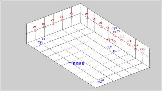 为了获得均匀一致的自然环境光,同时为了便于控制,我们完全遮挡了室外光线,利用柔光箱和室内顶灯来完全模拟自然光照环境。图2所示,4台60×60CM正丰BTE-150D柔光箱(D0~D3)依次放置在被采集对象两侧以及正前方,距离拍摄者1.8M。D0~D2向上倾斜45度,D3向下倾斜45度,充分保证了光线均匀散射在被拍摄者的面部,具有很强的方向性。屋顶布置5盏灯D4~D8来模拟顶光,消除被拍摄者额头的出现的阴影。D4~D7安装在屋顶四个角落,D8则安装在被拍摄者头顶正上方,均采用带罩65W节能灯。多光源分布环境使得我们在暗室环境下也能拍摄到真实感很强的人脸面部图像。