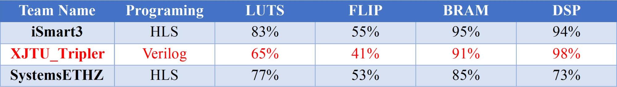 如下表所示为DAC19的竞赛结果,全球共有58支队伍注册了FPGA比赛任务,但最终只有11支队伍提交了设计(完赛率19%),相比GPU赛道52支队伍注册比赛,最终有16支队伍提交设计(完赛率30.8%),也可以反应出FPGA比赛任务的难度。最终我们团队获得了第2名的成绩。冠军为iSmart3,由UIUC、IBM、Inspirit IoT公司联合组队,季军为SystemsETHZ来自ETH Zurich的队伍。通过与其他团队的交流,我们团队使用的神经网络规模是最大的,优势是高性能的DNN加速器,遗憾是算法方面的优化还不到位,最终竞赛成绩如下: