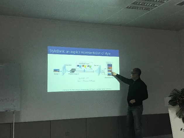 报告会开始前,所长郑南宁教授作了开场致辞,介绍了西安交通大学人工智能人才拔尖班的筹备情况。郑老师说,我们不仅需要培养一流的科学家,也需要培养一流的工程师,只有这样,才能真正推动人工智能研究的不断进步和发展。报告会上,华刚博士首先回顾了计算机视觉和模式识别研究的几个重要发展阶段。然后指出目前黑箱式的深度神经网络逐渐取代了传统的模块化分步式的视觉信息处理框架,虽然在识别等任务上的性能不断提升,但是其背后的理论依据比较匮乏,大部分研究人员仅将深度网络当作黑箱进行组合和重构来处理新问题。针对上述问题,华刚博士及其课题组希望从对视觉模式解构和理解的角度出发,通过引入特定域的知识来破解深度神经网络的黑箱,使研究人员能够有目的地控制深度神经的结构设计,并获得可理解的深度模型。例如,通过在自编码器中嵌入可替换的卷积核,对视觉风格模式解构,实现高效的图像艺术化风格自动转换。通过在生成对抗网络中嵌入自然语言的属性描述,对视觉信息的结构和类别模式解构,实现符合特定描述的图像生成。通过对最新研究成果的介绍,华刚博士表示,虽然追求识别性能的提升对于计算机视觉的研究具有重要意义,但是对视觉模式的解构和理解同样意义非凡,是我们不能忽视的重要研究方向。