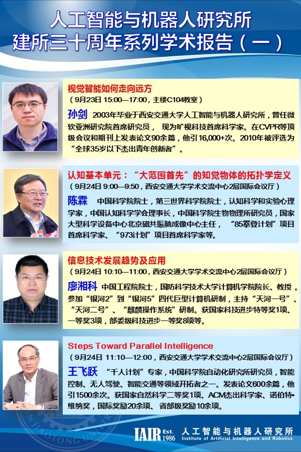 9月24日上午,“人工智能与机器人研究所建所三十周年系列学术报告会暨创新与创业论坛”在西安交通大学学术交流中心正式拉开帷幕。开幕式上,现任所长郑南宁教授回顾了研究所过去三十年的发展,同时展望未来,希望大家继续发扬坚持、包容、协作的人机所追求卓越精神,并代表人机所第一任所长宣国荣教授祝福建所三十周年、问候全体师生。毕业生代表西龙同辉有限公司王龙总裁感慨自己是人机所第一批毕业的学生,成为了大家的大师兄。三十年来,人机所培养了许多优秀学生,他有幸成为其中一员;并且特别祝贺人机所在郑老师的带领下,在师弟师妹们的努力下,在视觉领域取得了很多很好的成果!教师代表薛建儒教授回忆了自己1996年考入人机所,之后留所任教,在所学习工作二十年的历程。这些年,人机所优良的学风及团队精神对他有着深远的影响;下一个十年,在所里师生的共同努力下,人机所定将继续步入大发展的阶段。博士生代表董航同学表示要用实际行动践行人机所严谨、踏实、积极、上进的精神和团队协作的作风;硕士生代表余思雨同学表示人机所的人文关怀带给了她归属感,期望自己能团结同学,继续传承人机所“优秀是一种习惯”的传统。