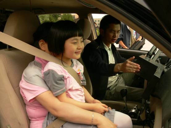 展示的第二个环节,老师带上小孩坐在无人车上亲身体验无人驾驶的过程,上车后小女孩快乐与兴奋的心情全然表现在了脸上。