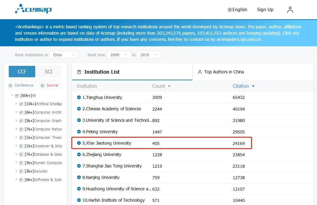 近日,上海交大Acemap团队开发了全球顶级研究机构排名系统AceRankings,该排名系统根据中国计算机学会(CCF)推荐的A类会议和期刊上发表论文的引用量,对中美Top 50的研究机构和相关学者进行了排名。我校在2009至2019年十年间论文引用量位居全国研究机构第五名,进入前五名的机构还包括:清华大学、中国科学院、中国科技大学和北京大学。