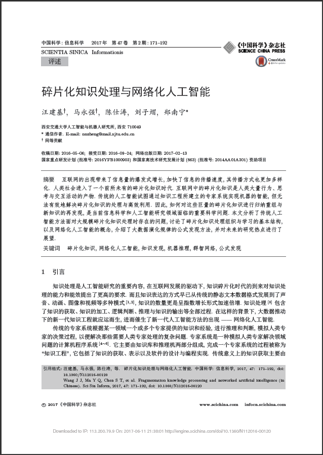 近日,人机所发表论文《碎片化知识处理与网络化人工智能》(作者:汪建基#、马永强#、陈仕韬、刘子熠、郑南宁*,通讯作者:郑南宁)被《中国科学:信息科学》评为2019年热点论文奖。
