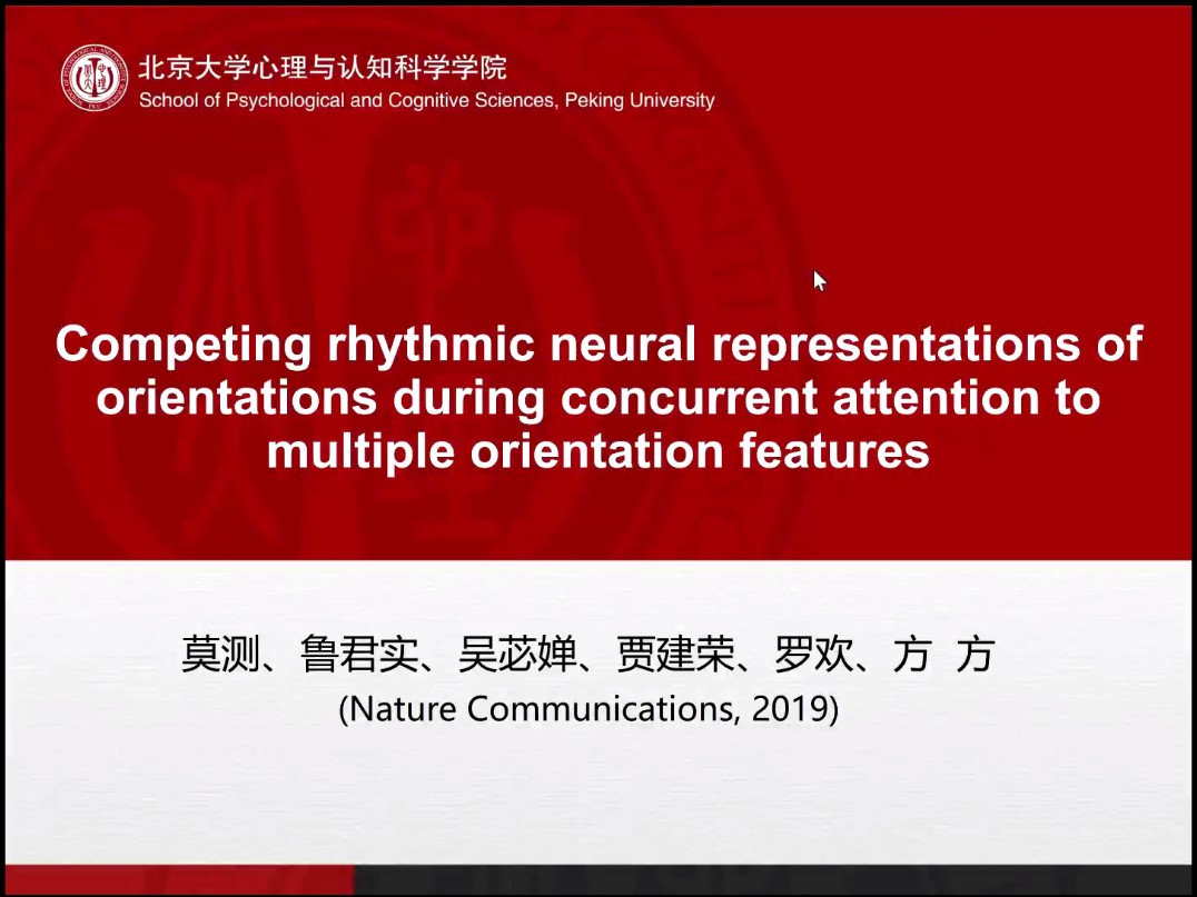 方方教授通过视频形式分享了在认知领域的最新研究成果,报告题目为Competing rhythmic neural representations of orientations during concurrent attention to multiple orientation features。