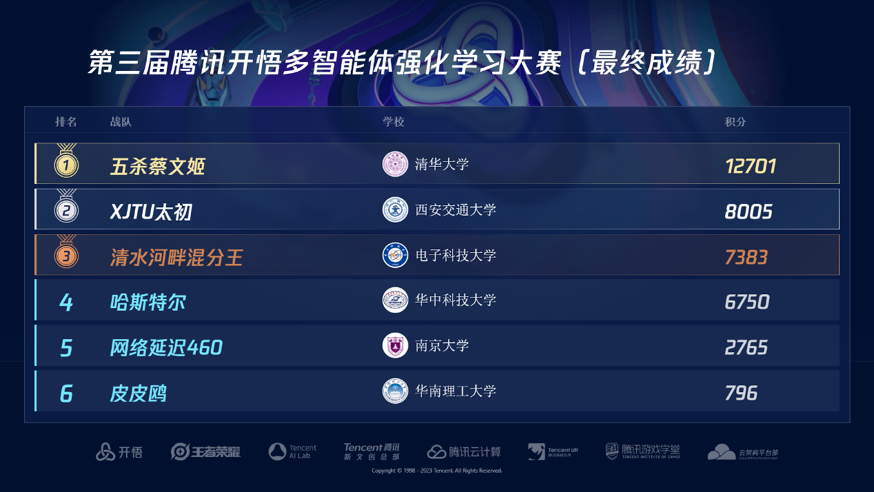 为了推动AI+游戏产业升级及人工智能研究的发展,腾讯AI Lab与王者荣耀团队联合举办的第三届腾讯开悟多智能体强化学习大赛(简称开悟大赛)决赛于近日圆满落幕。本届大赛于2022年9月1日正式启动,来自全国顶尖高校的30多支团队参赛,经过半年多的比拼,共有六支队伍进入决赛。经过激烈角逐,由威廉希尔中国官网兰旭光教授领衔的“XJTU太初”团队(队员:王宇航、戴洋、寇谦、王思哲、石昃忱,指导教师:兰旭光、陈星宇),在决赛中获得了亚军的好成绩,获得10万元奖金。