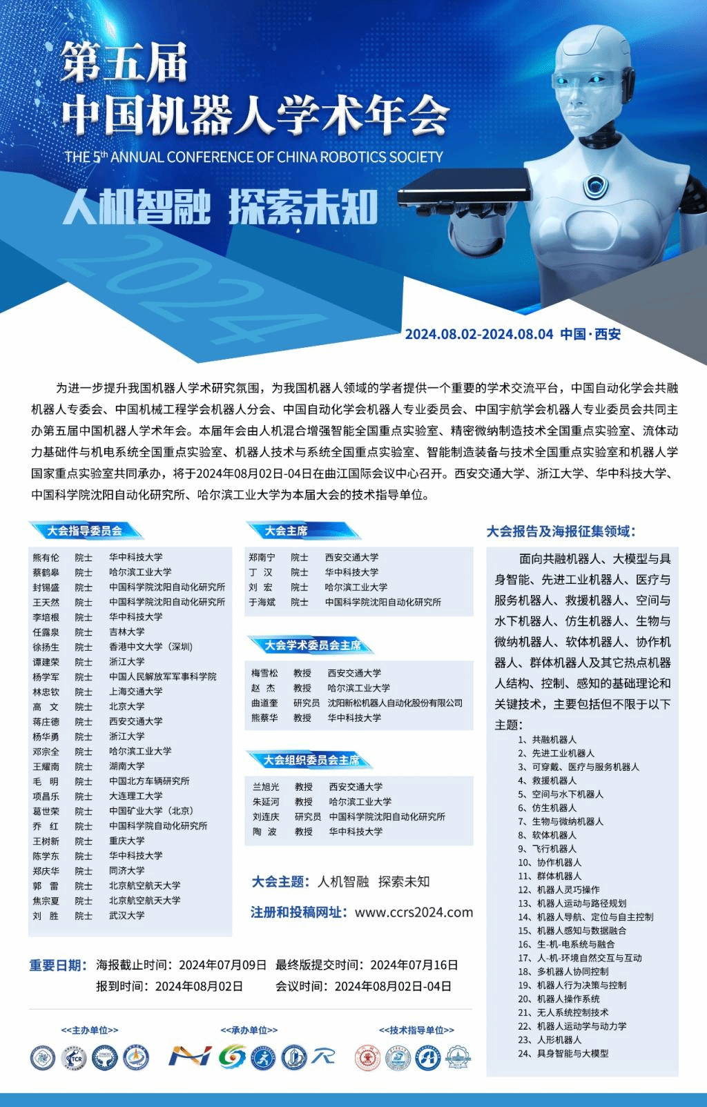 第五届中国机器人学术年会,将于2024年8月2日-4日在西安曲江国际会议中心举办。西安交通大学作为本届盛会承办方,诚挚邀请全国人工智能与机器人领域相关科技工作者相聚古都,共襄盛会。