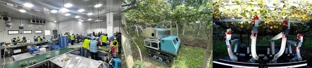 在京东农场周至县周一村数字农业基地,团队成员深入考察智能机器人在猕猴桃产业的成功应用。据了解,该基地作为国内领先的猕猴桃产业示范点,将智能机器人技术与产业链全流程深度融合,有效缓解劳动力季节性短缺问题。特别是授粉机器人,通过“感知-决策-执行”闭环系统,在猕猴桃花期短、时效要求高的挑战下,实现85%授粉面积覆盖,显著提升坐果率与商品果一致性。