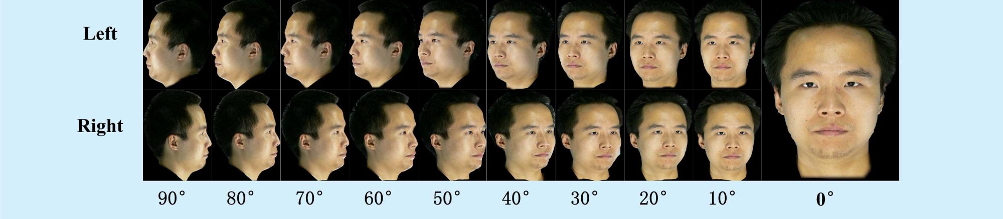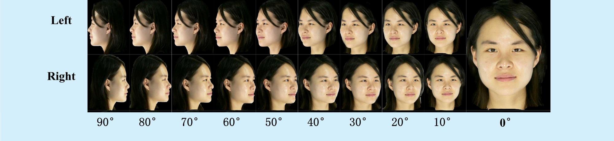 在环境光照模式下,要求被拍摄者眼睛平视正前方的C9相机,调节升降椅的高度使其双眼高度为1.3M。多角度照相机系统一次拍摄,可同时获得19张(10°为一个单位)不同视点角度下的图像。视点子库示例图像如下图所示。