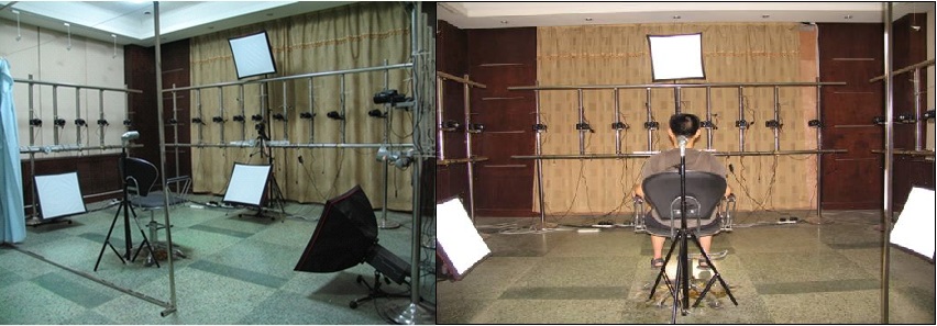 为了获得均匀一致的自然环境光,同时为了便于控制,我们完全遮挡了室外光线,利用柔光箱和室内顶灯来完全模拟自然光照环境。图2所示,4台60×60CM正丰BTE-150D柔光箱(D0~D3)依次放置在被采集对象两侧以及正前方,距离拍摄者1.8M。D0~D2向上倾斜45度,D3向下倾斜45度,充分保证了光线均匀散射在被拍摄者的面部,具有很强的方向性。屋顶布置5盏灯D4~D8来模拟顶光,消除被拍摄者额头的出现的阴影。D4~D7安装在屋顶四个角落,D8则安装在被拍摄者头顶正上方,均采用带罩65W节能灯。多光源分布环境使得我们在暗室环境下也能拍摄到真实感很强的人脸面部图像。