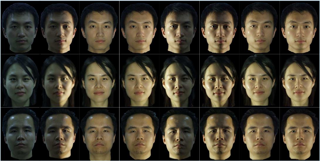 光照子库采用单相机进行拍摄。在大自然和人们日常生活工作中,有各种光照变化。我们模拟了正面人脸的8种不同光照组合,包括正面来光、左侧面来光、右侧面来光以及这三种光的各种组合。使用3盏卤素射灯(L0~L2)作为点光源来实现8种不同的光照组合。并专门设计了一个灯光控制电路来分别控制L0~L2的8种不同开关组合状态,来模拟不同的光照条件。示例图像如下: