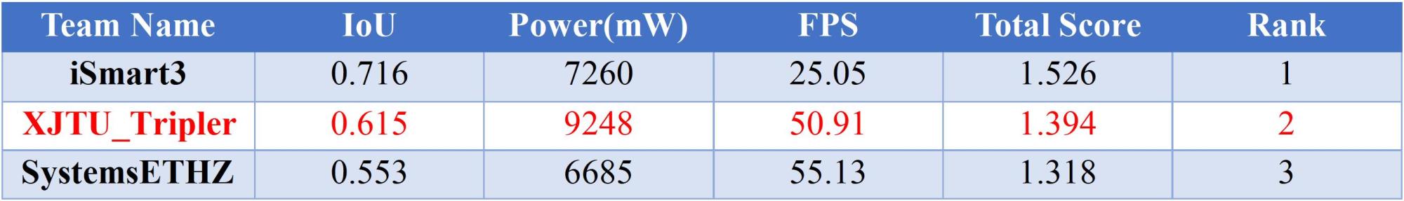 经过上述优化,我们团队的设计在比赛方的数据集上测得如下结果:准确率IoU为61.5%;能耗为9537J,帧率为50.91Hz,功率为9.248W。